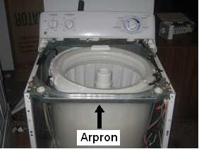 The apron is the metal bracket that extends from one side of the washer case to the other holding the washer tub up. To repair this you must install a Cover and Front Apron Bracket Repair Kit part number WH49X10065 Order Here for white color models and WH49X10066 Order Here for bisque color models. You will need a drill and a 1/8-inch bit. Instructions should come with the part. Also note that you will be replacing the top, which has the model/serial number tag. Don’t forget to transfer the tag from the old top to the new top.
